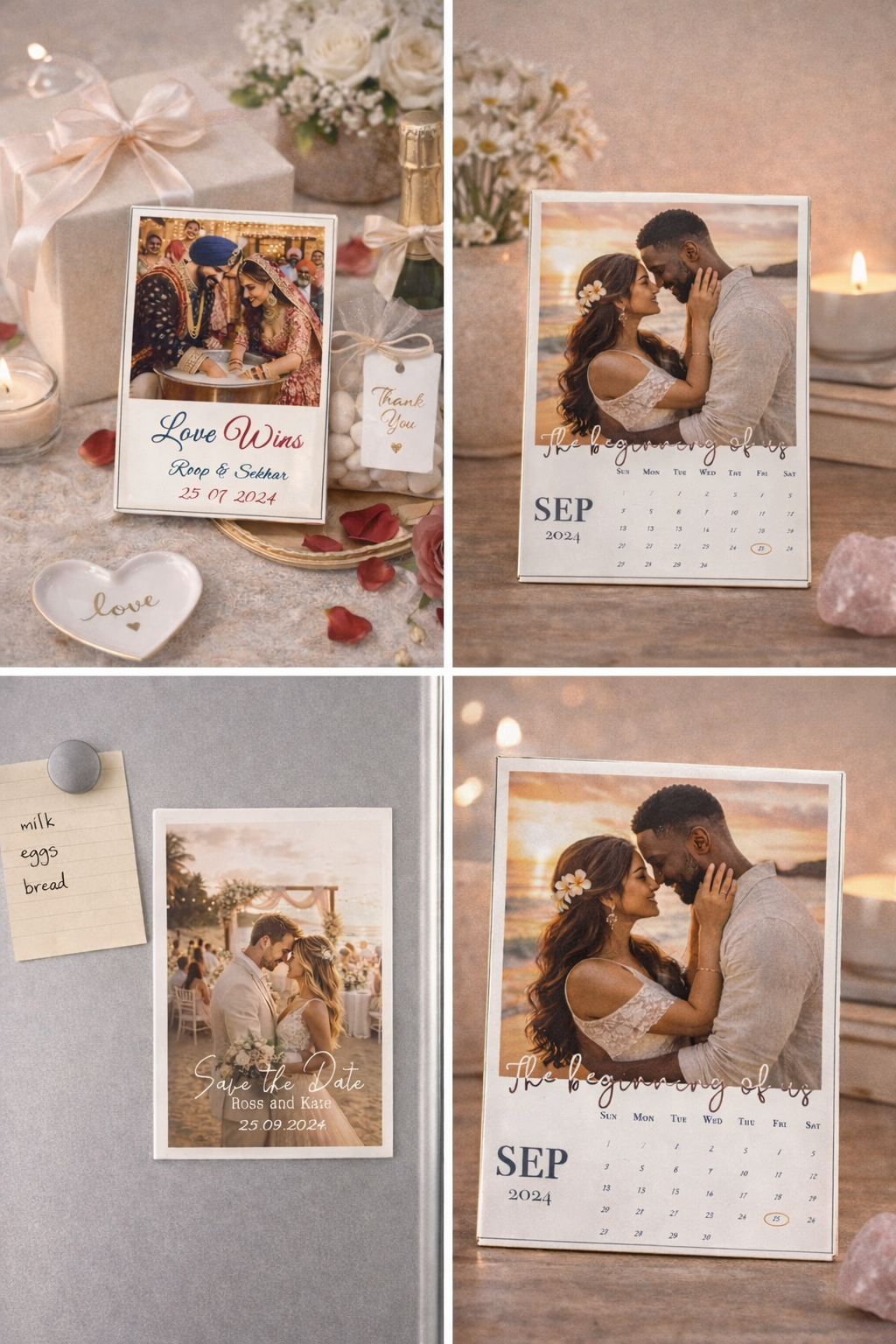 You can choose from 4 beautifully designed styles (shown clearly in the listing images) and personalize them with your own photo, names, and special date.