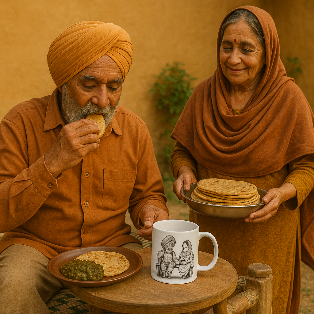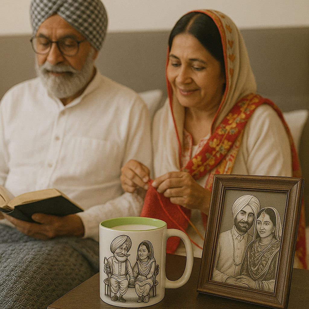 Featuring a black-and-white sketch of an elderly Sikh couple holding hands, this mug beautifully symbolizes enduring love — perfect for your parents’ or grandparents’ anniversary.